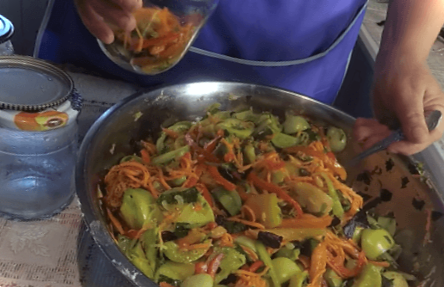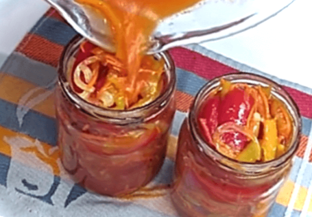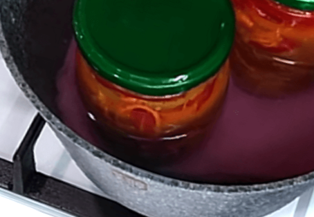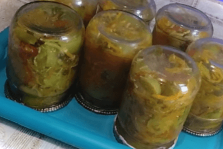 Під залізні кришки таку закуску краще не закривати. Але якщо ви хочете її залишити на зиму, тоді її потрібно перекласти в стерильні банки і стерилізувати звичайним способом в каструлі з водою.