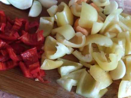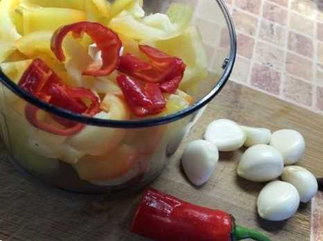 Крок 1. Готуємо овочі (болгарський та гіркий перець, часник). Їх миємо, очищаємо і нарізаємо невеликими шматочками і щоб вони в блендер.