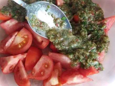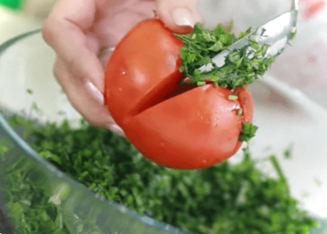Розсуваємо надріз та накладаємо туди зелень. Наповнюємо начинкою спочатку один надріз, потім інший. Злегка стискаємо надрізи і кладемо помідор у каструлю. Зелені не шкодуємо, начиняємо по максимуму.