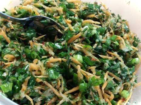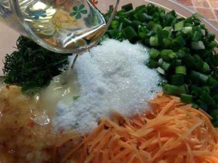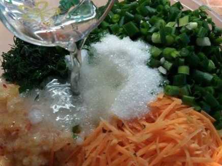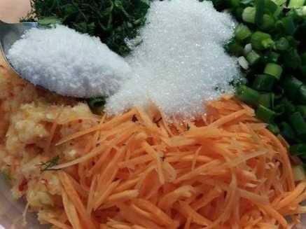 Крок 4. Зелень і морква теж складаємо в миску з подрібненим перцем і часником. Додаємо до них цукор та сіль,