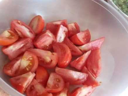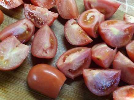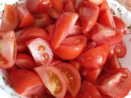 Крок 2. Томати теж миємо, протираємо рушником, щоб забрати зайву вологу. Нарізаємо на 2-4 частини залежно від їхньої величини.