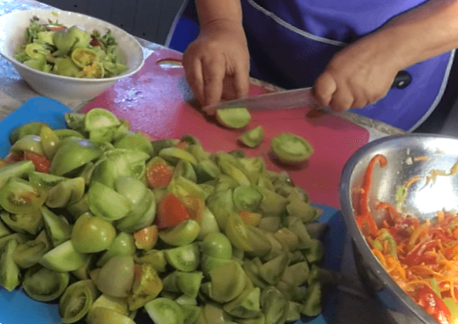Крок 6. Тим часом нарізаємо невеликими скибочками зелені помідори (на 6-8 частин). Краще взяти ті, які тільки-но починають зріти, тобто бурі.