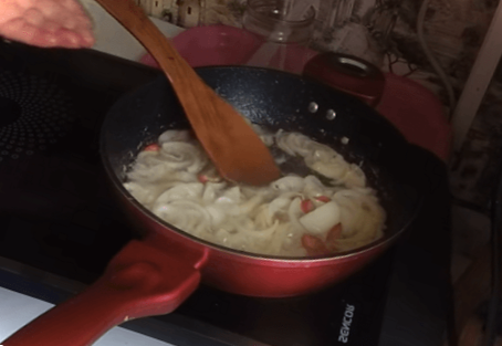 Крок 3. На сковороду наливаємо олію. Чекаємо, коли воно нагріється, і відправляємо до нього нарізану півкільцями цибулю. Смажимо цибулю до прозорості.