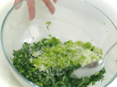 Крок 2. Тепер ми готуємо начинку. Виріжте товсті стебла з гілки зелені. Але викидати їх не потрібно, вони ще знадобляться. А зелень, що залишилася, дрібно нарізаємо і пересипаємо її в миску.