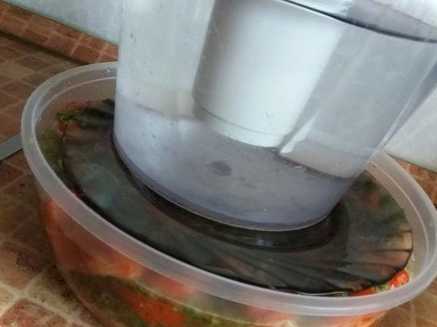 Щоб помідори не спливли, ставимо на тарілку гніт, наприклад банку з водою. Залишаємо так їх маринуватися на добу.