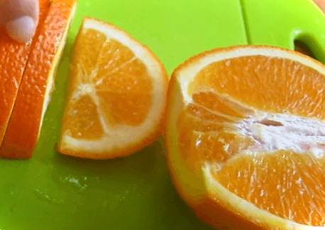 Крок 2. Апельсин добре помити, порізати його спочатку скибочками, а потім на шматочки, прибираючи насіння.