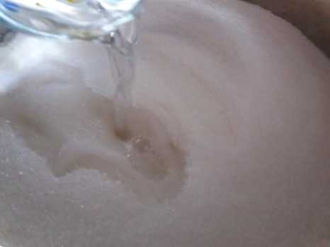 Крок 2. Готуємо сироп. Насипаємо цукор в ємність, в якій варитимемо варення, додаємо 1 склянку води і сік з половинки лимона (це якраз вийде 2 ст. л.). Розмішуємо цукор, щоб він добре просочився водою та розчинився.