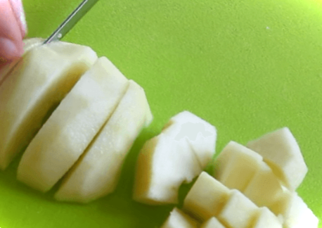 Крок 1. Яблука миють і очищають від шкірки та насіння. Потім нарізують невеликими кубиками. Складають їх у каструлю.