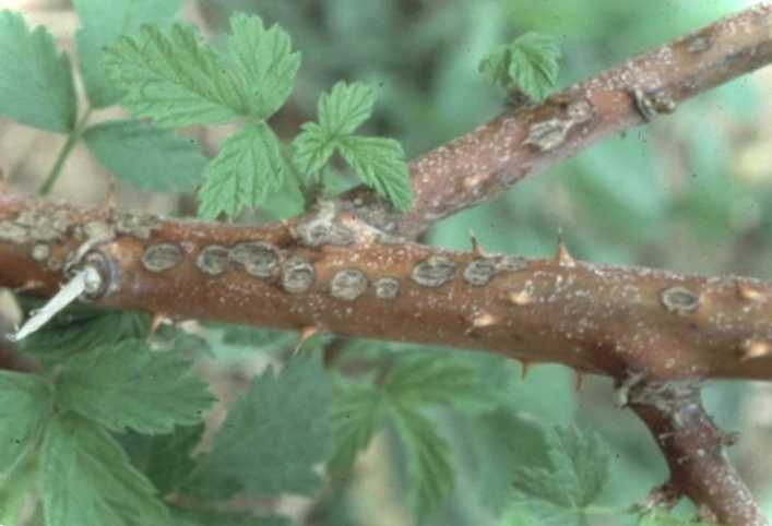 Антракноз може вразити будь-яку частину малинового куща, проте найчастіше страждають молоді пагони. Зверніть увагу на розсіяні, пурпурні, округлі плями (до ⅜ дюйма в діаметрі), які характерні для цього захворювання. Згодом плями набувають попелястий колір, запалі центри та підняті пурпурові краї.