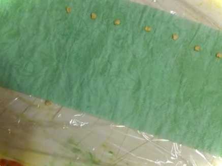 На підносі розстеліть плівку, а поверх неї 2 шари туалетного паперу довжиною приблизно 30 см. Збризкайте туалетний папір теплою водою з пульверизатора. Розкладіть поверх насіння перців через 2-3 см, відступивши від краю паперу 1-1,5 см. Ще раз збризкайте насіння з розпилювача.