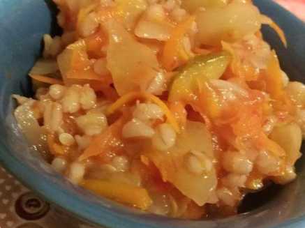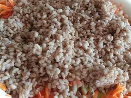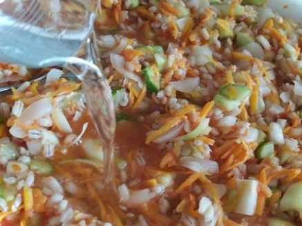 Після цього в таз висипаємо відварену перловку і знову перемішуємо. Не турбуйтеся, якщо вмісту в тазі чи каструлі буде багато. У процесі приготування обсяг значно зменшиться.