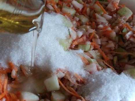 Потім насипаємо до овочів сіль і цукор, наливаємо олію.
