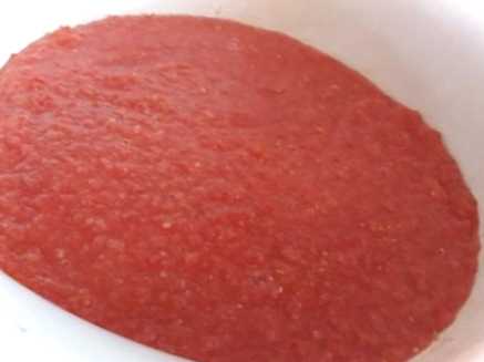 Крок 4. У великий таз виливаємо подрібнені у блендері (або пропущені через м'ясорубку) помідори.