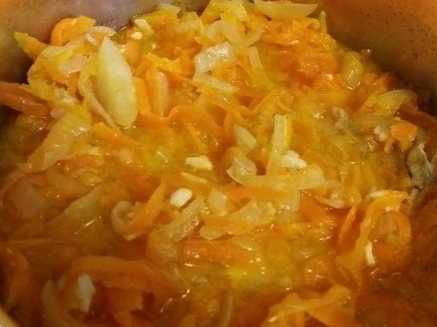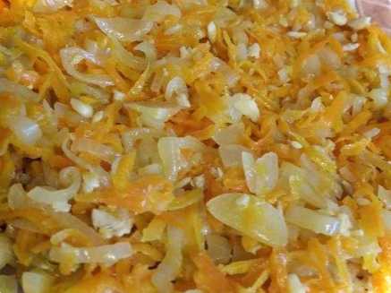 Очищаємо цибулю та моркву. Цибулю нарізаємо тонкими півкільцями, моркву натираємо на великій тертці. На сковороді з олією спочатку обсмажуємо цибулю до прозорості, а потім до них додаємо моркву, і ще кілька хвилин їх обсмажуємо.