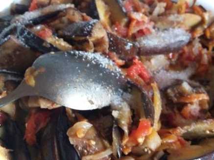 Накладайте сині одним шаром, так вони швидше обсмажаться. Підсмажені перекладають до овочів.