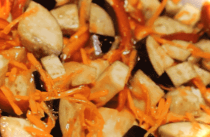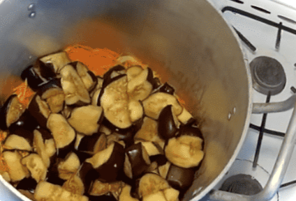 Додаємо оцет і відправляємо туди ж овочі, спочатку моркву, а в останню чергу баклажани.