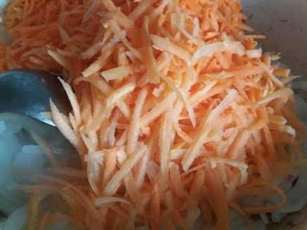 Потім до цибулі додаємо моркву і смажимо разом із цибулею ще 3-5 хвилин.