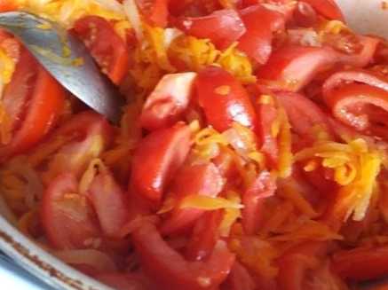 Наступним етапом йдуть помідори. Помідори дають сік і у нас овочі вже тушкуються. Можна прикрити кришкою та гасити хвилин п'ять. Тушковані овочі перекладаємо у просторий таз або каструлю.