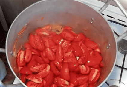 Перекручені через м'ясорубку помідори в каструлі солимо і доводимо до кипіння. Як тільки вони закипіли, додаємо сіль, цукор, спеції та олію. Варимо 5 хвилин, щоб сіль та цукор розчинилися.