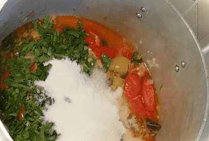 Коли помідори стануть м'якими додаємо сіль, цукор, оцет та зелень.