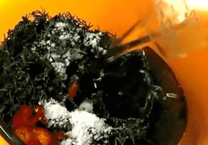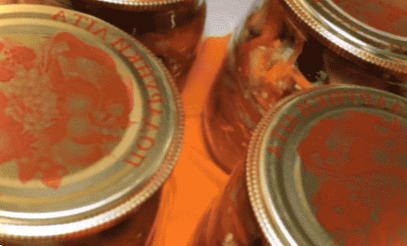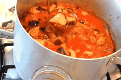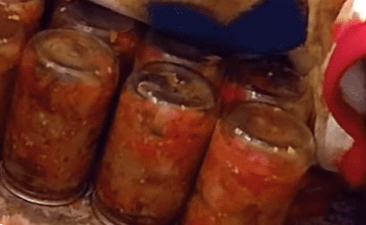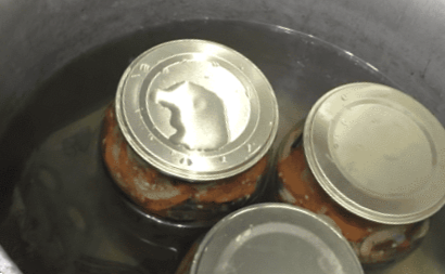 Джерело: https://youtu.ru/qZhDWHmQsZ4У каструлю на дно кладемо серветку, ставимо банки і наливаємо теплу воду до плічок. Стерилізуємо банки 15 хвилин із моменту закипання. Після заготівлі дістаємо, закочуємо, перевертаємо і залишаємо так до повного остигання