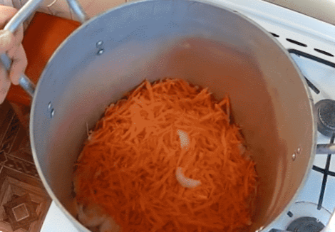 На сковороду наливаємо 2 ст. л. рослинної олії, нагріваємо її, а потім викладаємо моркву та обсмажуємо її не більше 3 хвилин. Забираємо сковороду з морквою з вогню і, помішуючи, даємо моркви трохи охолонути, а потім додаємо моркву до решти овочів у таз.