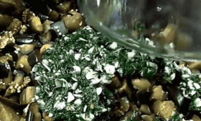 На іншій сковороді, додавши трохи олії, обсмажуємо дрібно порізаний часник.