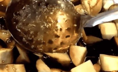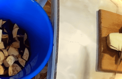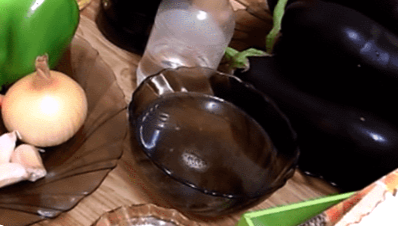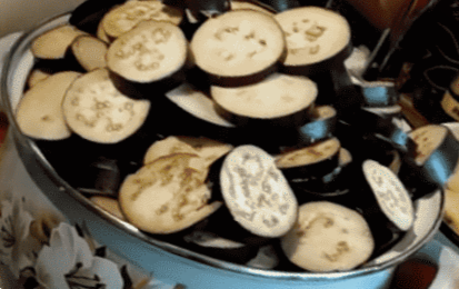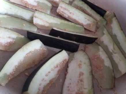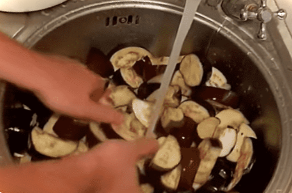 У той же час, ми зливаємо воду з баклажанів, миваємо під проточною водою,