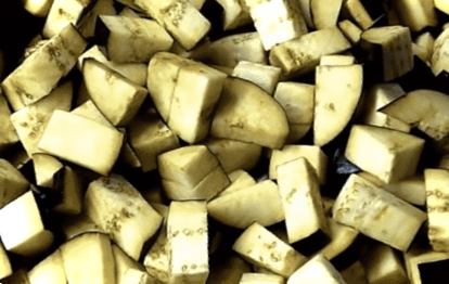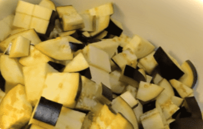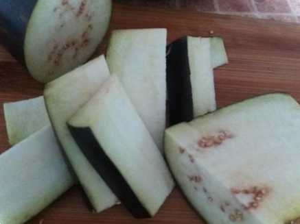 Баклажани миють і нарізують невеликими шматочками довільної форми.