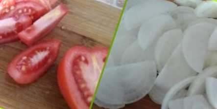 Готуємо овочі: цибулю нарізаємо півкільцями, моркву натираємо на великій тертці, помідори нарізаємо часточками.