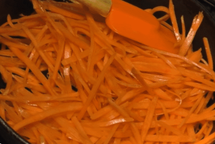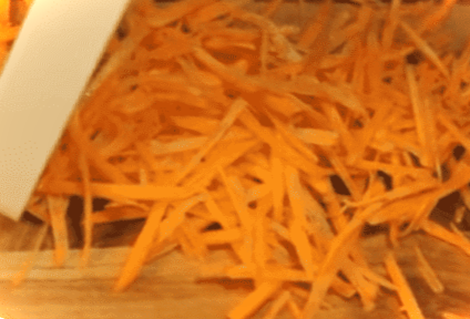 - Очищаємо моркву і шаткуємо її на спеціальній тертці для корейської моркви довгою соломкою.
