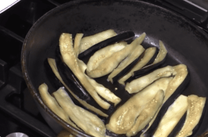 Через 2 години знову займаємося баклажанами. Знімаємо гніт, зливаємо сік, що утворився, промиваємо синенькі під проточною водою. Потім скибочки обсушуємо на рушник, можна скористатися паперовими. Потрібно, щоб скибочки були сухими, тому що їх зараз потрібно буде обсмажувати на олії. На сковороду наливаємо 2 ст. л. олії, і обсмажуємо баклажани з обох боків до золотистої скоринки. Накладаємо їх на сковороду одним тонким шаром, так швидше та простіше їх смажити.