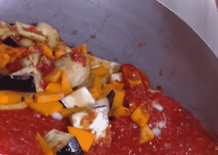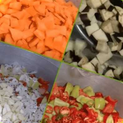 Спочатку готуємо овочі. Очищаємо і нарізаємо кубиками цибулю, кабачки, баклажани, різнобарвний болгарський перець, моркву тонкими пластинками, щоб вона встигла проваритись. Червоний гіркий перець нарізаємо дрібними шматочками. Помідори прокручуємо через м'ясорубку.