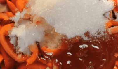Незадовго до закінчення варіння додаємо 1 ст. л. есенції, розведеної в 1 склянці води. Перемішуємо, доводимо салат до кипіння і розкладаємо гарячим по стерилізованих банкам. Зверху заливаємо соусом.