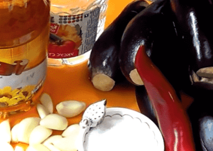 Пропоную приготувати ароматну та гостру закуску з баклажанів та кабачків з великою кількістю часнику, гострого перцю та зелені. Поєднання гострого перцю та часнику робить закуску не звичною для російської людини, хоча багатьом саме гострота і подобається. Для приготування використовуються звичайні овочі, які ростуть у багатьох на городі.