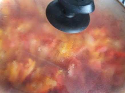 Овочеву масу варимо 20 хвилин з моменту закипання, при цьому овочі повинні уваритися вдвічі і повністю покрити томатним соком.
