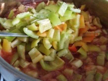 Крок 4. Поки кабачки тушкуються, у цей час болгарський перець очищаємо від насіння та нарізаємо невеликими шматочками. Перемішуємо добре і продовжуємо гасити ще 10 хвилин.