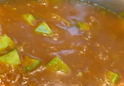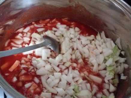 Крок 2. Тим часом нарізаємо дрібними кубиками цибулю. Додаємо його в томатний сік та варимо на середньому вогні 10 хвилин.