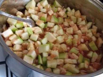 Крок 4. Всипаємо нарізані смужками кабачки і при акуратному помішуванні варитимемо 30 хвилин. Вони повинні добре проваритись, стати м'якими, але і, звичайно, розваритися вони не повинні.