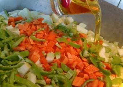 чорний мелений і гострий червоний перець. Наливаємо олію і ще залишаємо тушкувати всі овочі на 10 хвилин.
