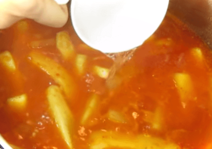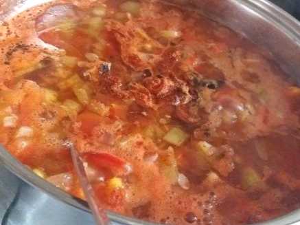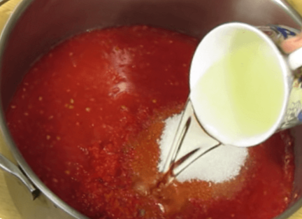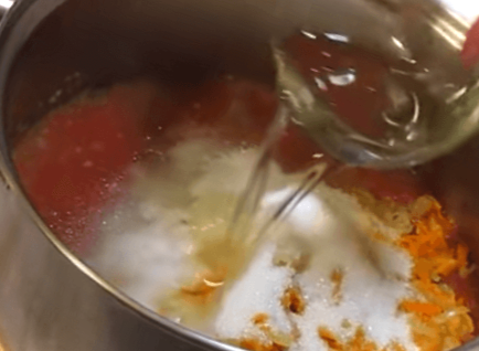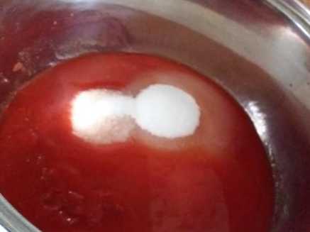 Крок 1. У велику каструлю виливаємо томатний соус, додаємо туди сіль, цукор та склянку води, розмішуємо. Вийшло щось на кшталт томатного соку. Ставимо каструлю на середній вогонь і даємо покипіти хвилин десять.
