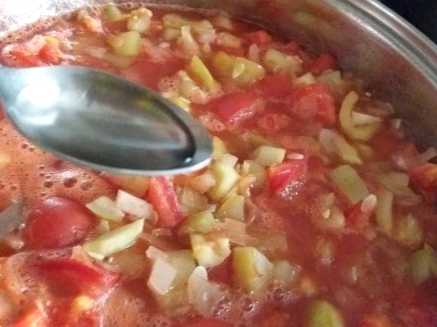 Крок 3. Готуємо соус. Для нього помідори перекручуємо на м'ясорубці або подрібнюємо у блендері. Помідорну масу переливаємо в каструлю, в якій готуватимемо закуску. Додаємо солодкий та гострий перець, їх теж подрібнюємо на м'ясорубці або у блендері.