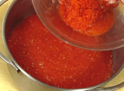 Крок 2. Помідори прокручуємо через м'ясорубку або подрібнюємо у блендері. Подрібнені томати переливаємо в каструлю. Туди ж додаємо прокручені через м'ясорубку гострий та солодкий перець.