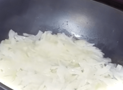 Крок 2. На попередньо розігріту глибоку сковороду наливаємо 100 мл олії та обсмажуємо на ній до прозорості цибулю. Періодично перемішуємо, щоб цибуля не стала занадто піджаристою.