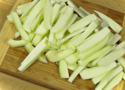 Крок 1. Кабачок нарізаємо смужками. Якщо плід зрілий, прибираємо шкірку та насіння. І вже в очищеному вигляді зважуємо овоч, його має бути 1 кг.