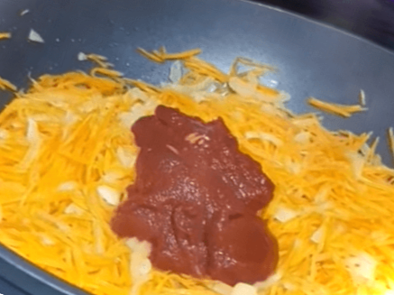 Добре перемішуємо та обсмажуємо їх разом 3-4 хвилини. Овочі в сковороді помітно осіли і зараз додаємо томатну пасту. Перемішуємо та обсмажуємо разом протягом 10 хвилин. Вийшла звичайна овочева засмажка.
