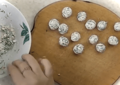 Крок 3. Дрібно нарізаємо кріп. Змішуємо його в окремій мисці з половиною пачки сиру Фета. З отриманої маси скачуємо невеликі кульки та викладаємо їх на обробну дошку.