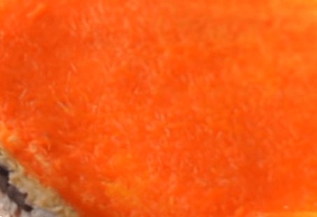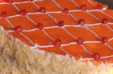 5-й останній шар - варена морква, натерта на дрібній тертці. Розрівнюємо шар моркви лопаткою.