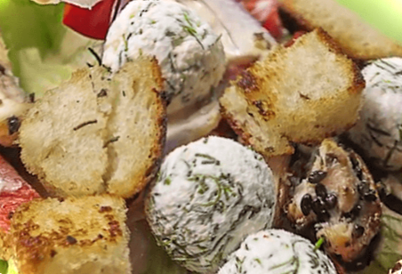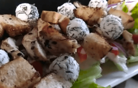 Наступний шар – нарізані тонкою соломкою обсмажене куряче філе. Зверху посипаємо обсмаженими грінками та розкладаємо кульки сиру з кропом.