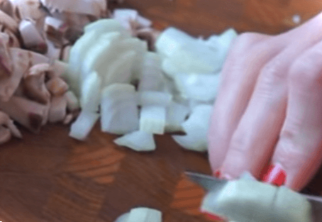 Щоб курне м'ясо не вийшло сухим, після того, як воно відвариться, залиште його в бульйоні до повного остигання.Крок 2. Гриби та цибулю поріжте дрібними кубиками і обсмажте їх потім на розігрітій сковороді з невеликою кількістю олії до готовності. Не забудьте посолити і поперчити їх до смаку.